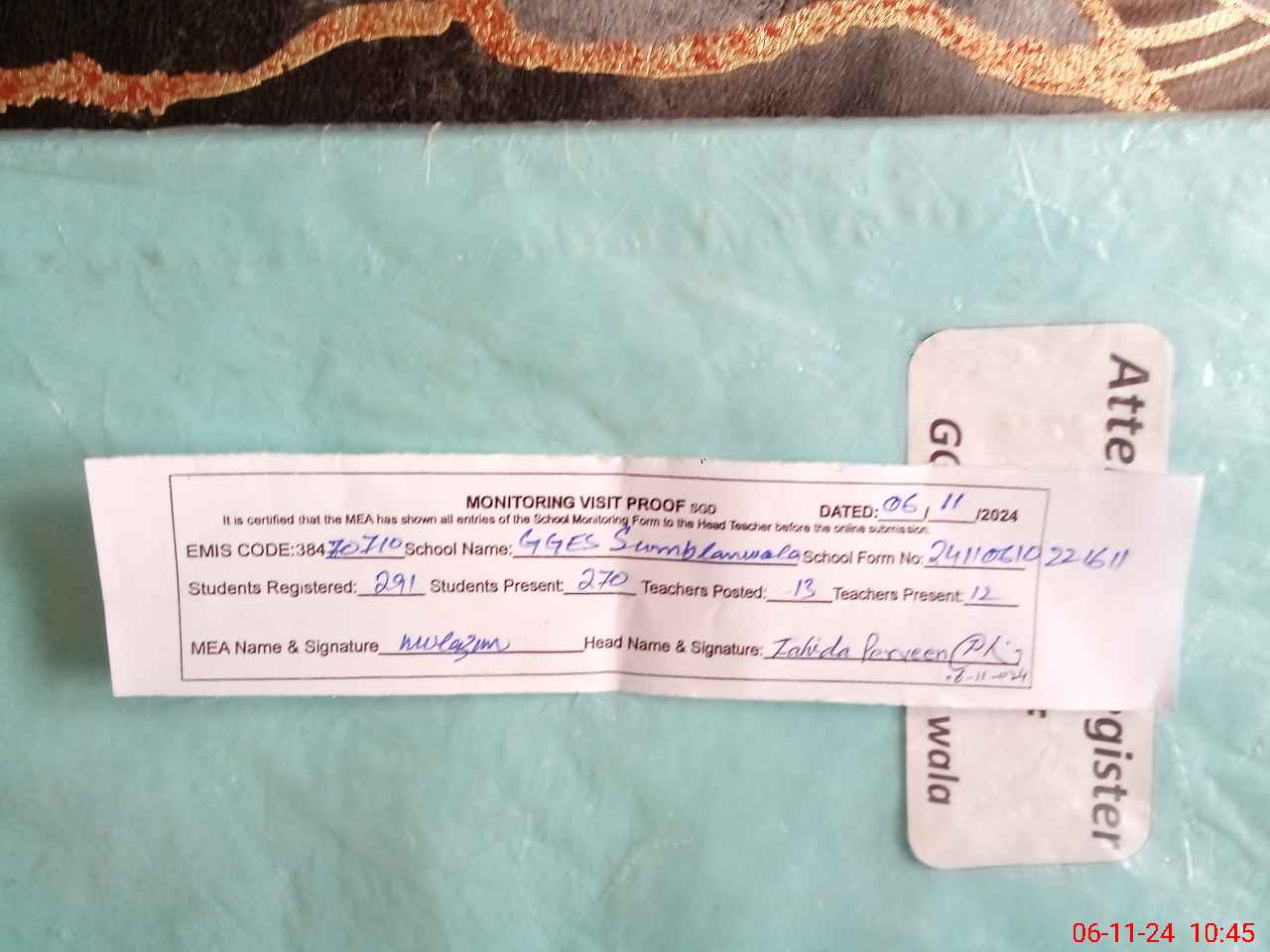 | Attendance Register | Head Teacher | MEA with School | Visit Proof |