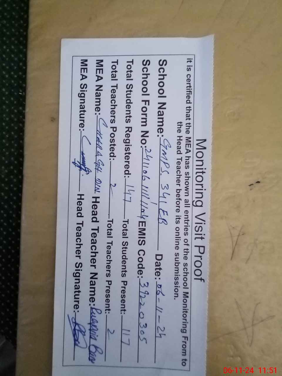 | Attendance Register | Head Teacher | MEA with School | Visit Proof |