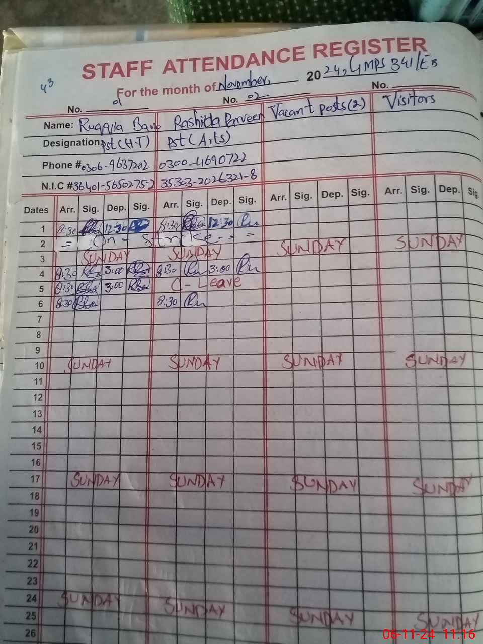 | CNIC | Full Name | Designation | R/C | Absence During Last Calender Month |