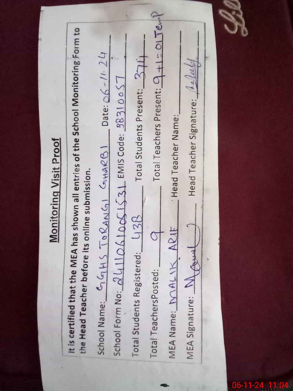 | EMIS Code: 38310057 | Name of School: GGHS TORANGI GHARBI | |||