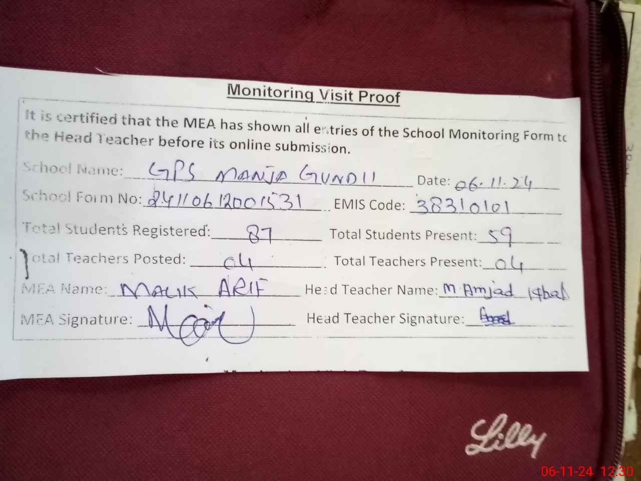 | Attendance Register | Head Teacher | MEA with School | Visit Proof |