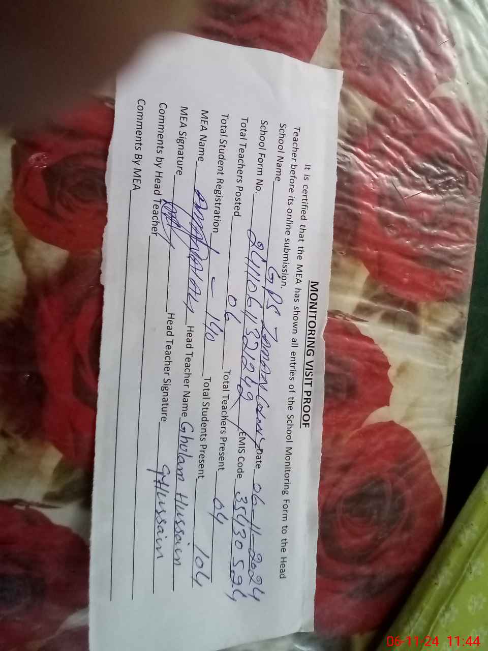 | Attendance Register | Head Teacher | MEA with School | Visit Proof |