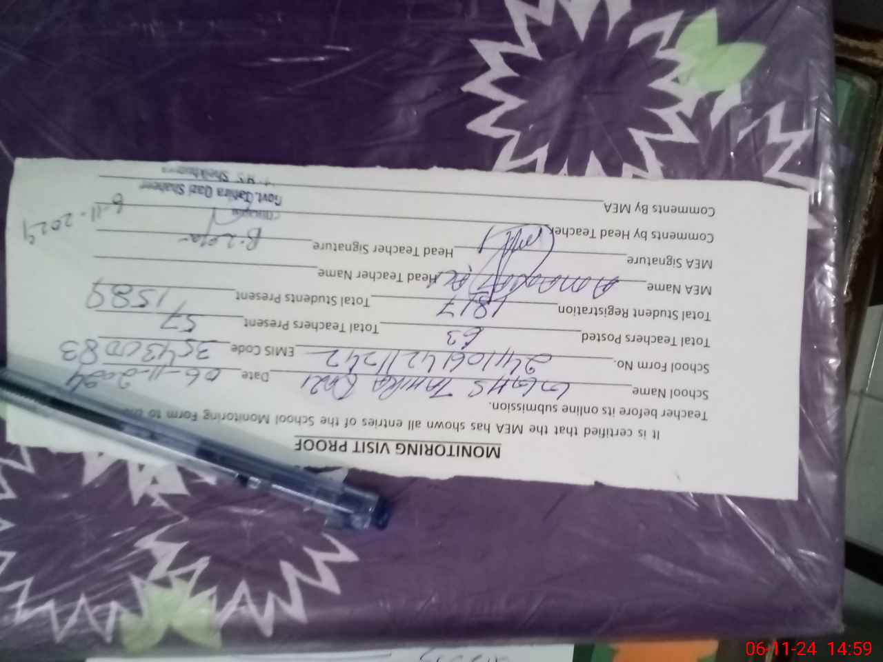 | Attendance Register | Head Teacher | MEA with School | Visit Proof |