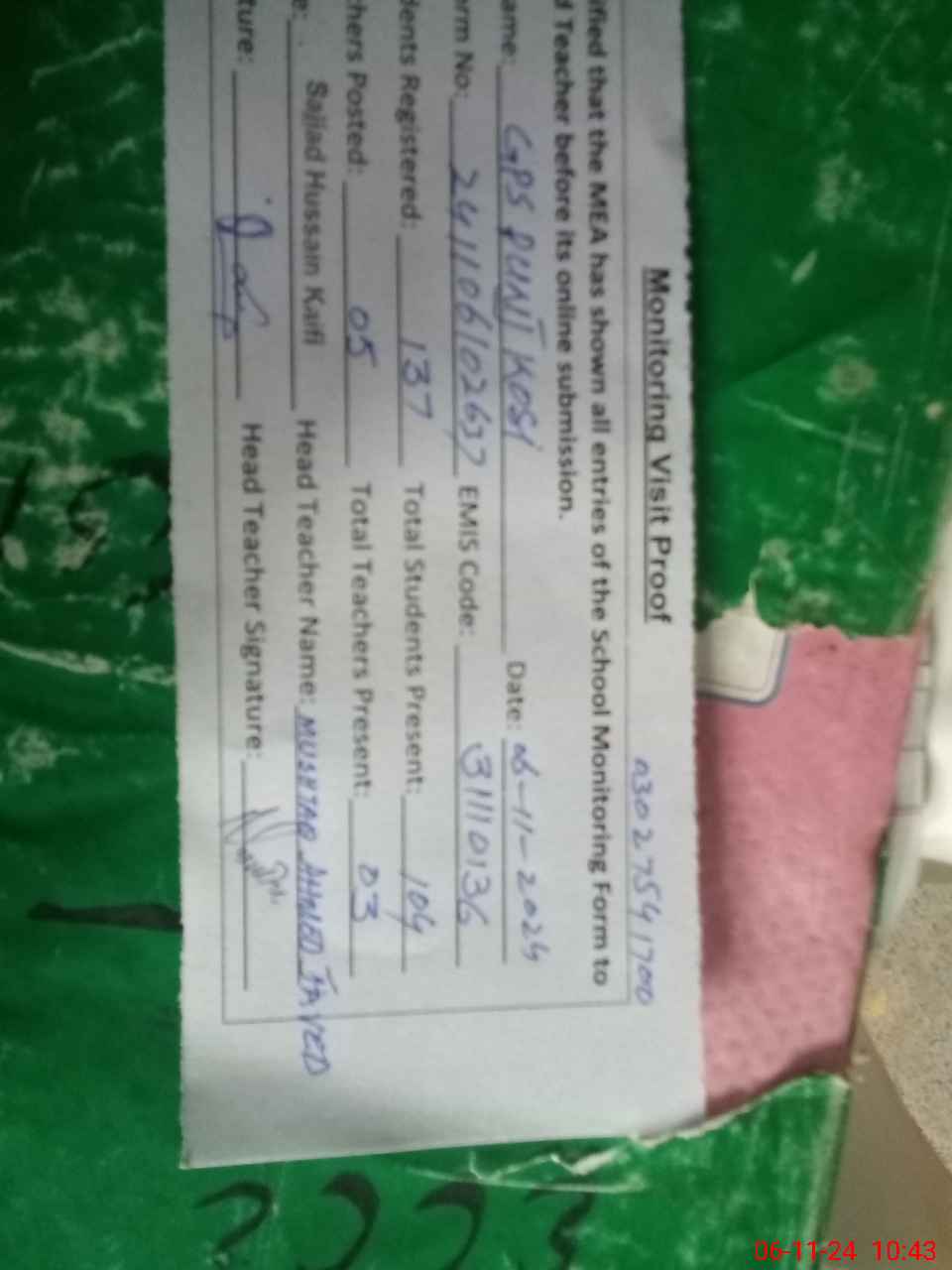 | Name: Mu**** Ah**** Ja**** Designation: (School Headmaster's/Headmistress's) PST Phone/Cell Number: 03**** |