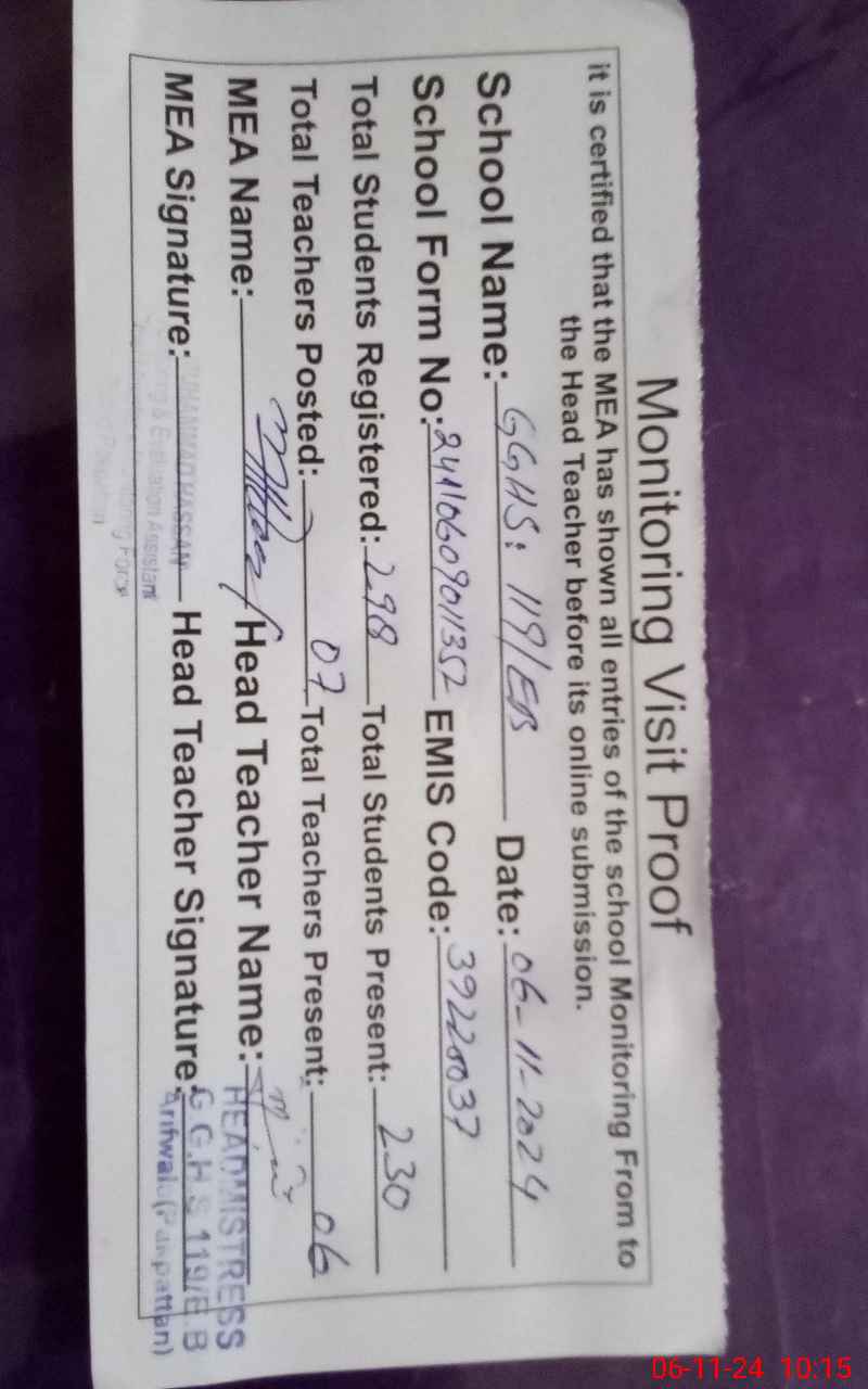 | EMIS Code: 39220037 | Name of School: GGHS 119 EB | |||