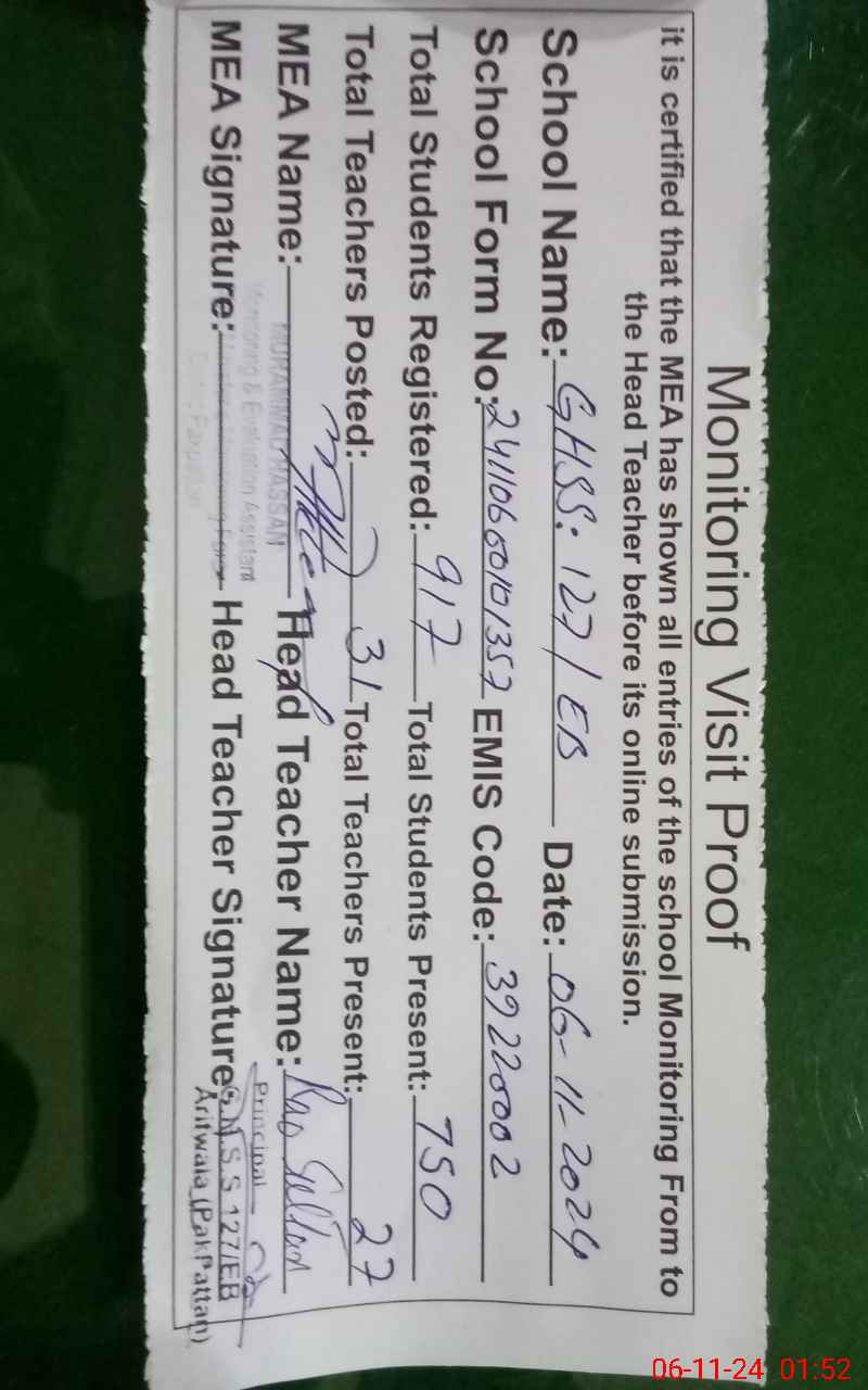 | EMIS Code: 39220002 | Name of School: GHSS 127/EB ARIFWALA | |||