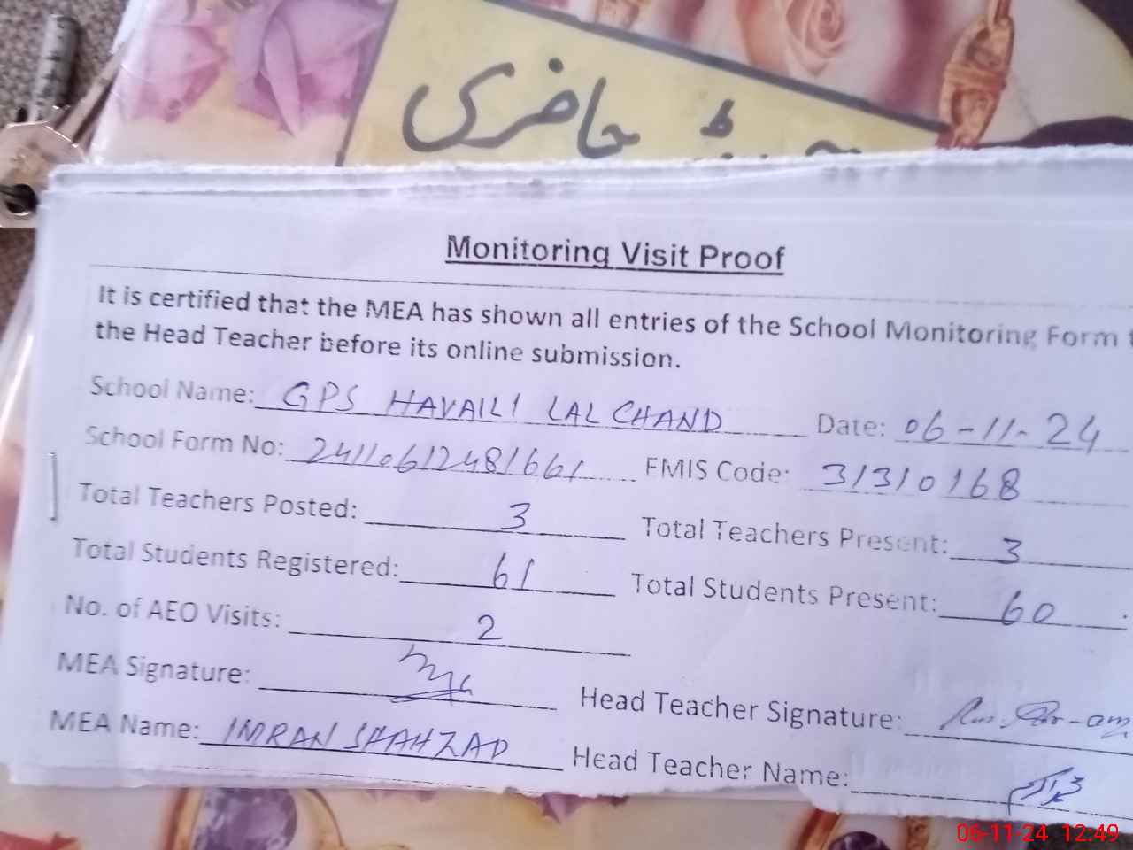 | Attendance Register | Head Teacher | MEA with School | Visit Proof |