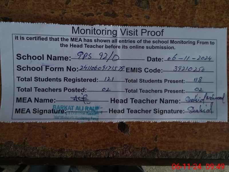 | EMIS Code: 39210250 | Name of School: GPS CHAK NO. 92 D | |||