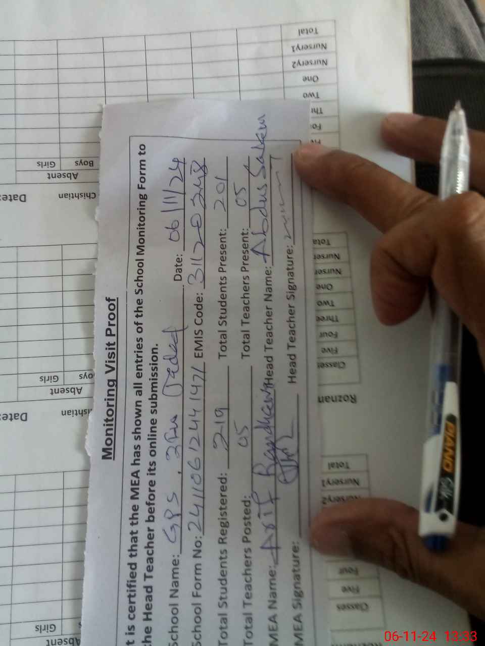 | Attendance Register | Head Teacher | MEA with School | Visit Proof |