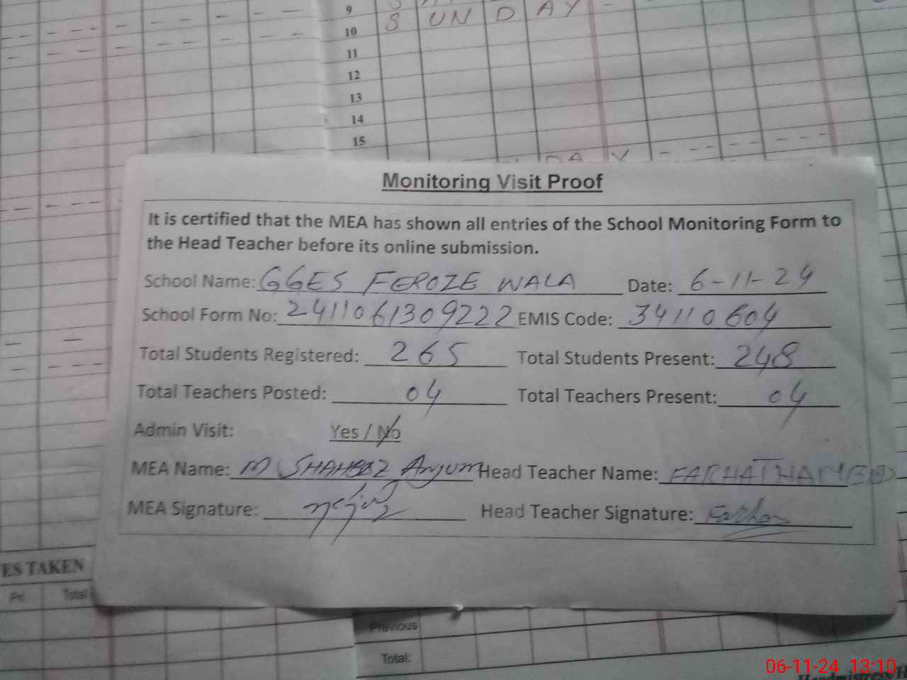 | Attendance Register | Head Teacher | MEA with School | Visit Proof |