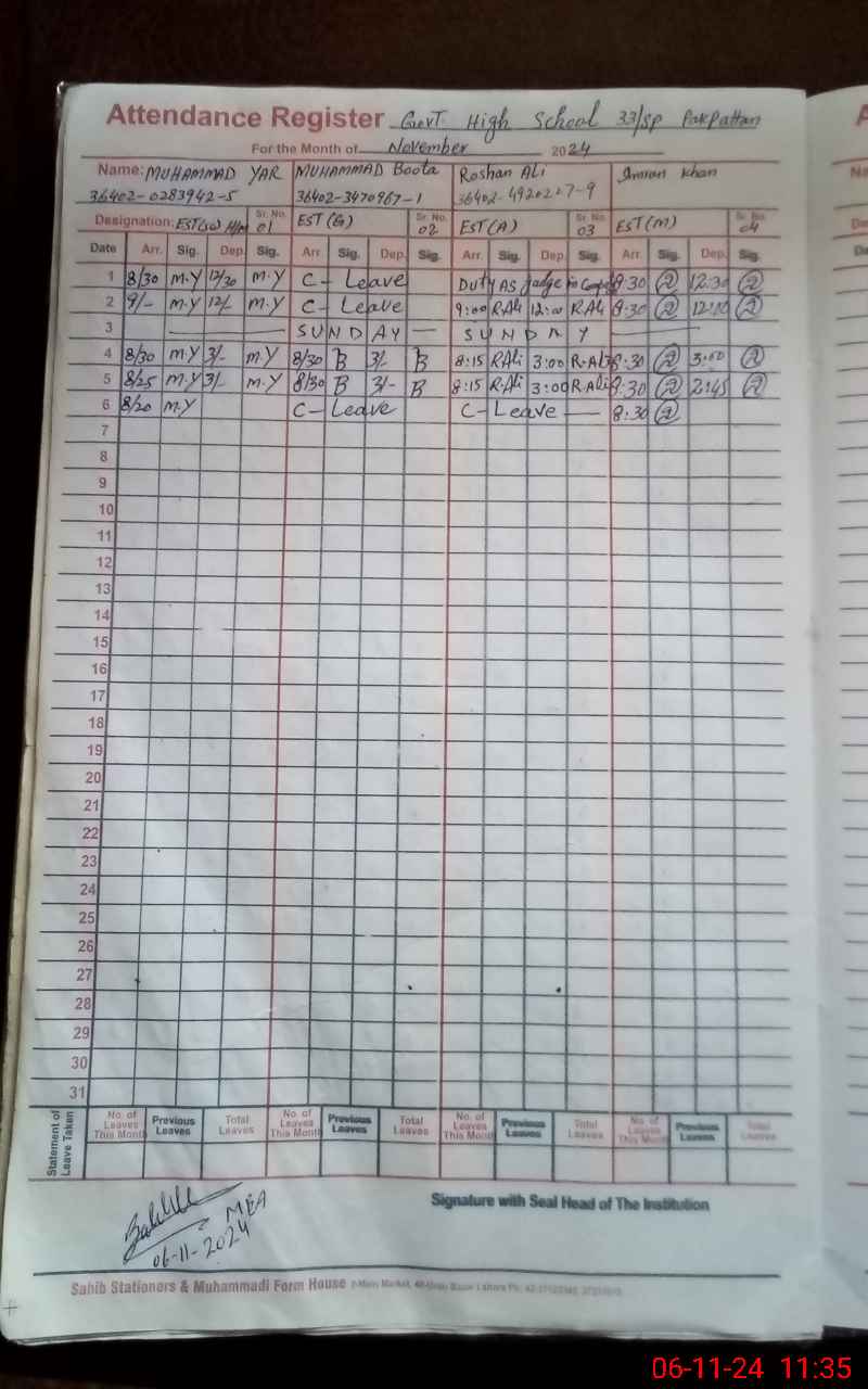 | CNIC | Full Name | Designation | R/C | Absence During Last Calender Month |