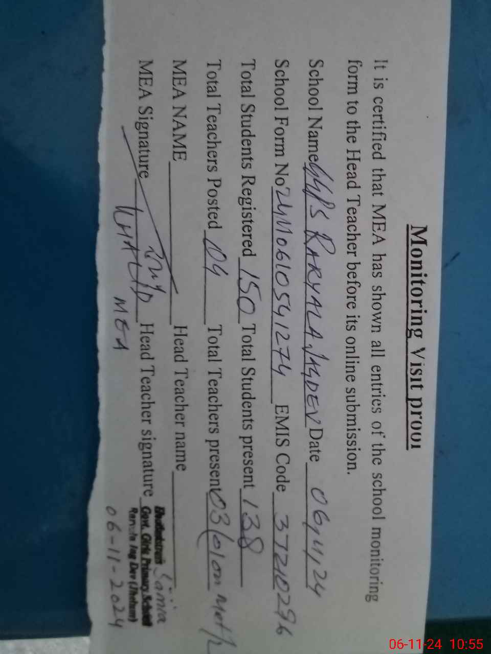 | Attendance Register | Head Teacher | MEA with School | Visit Proof |