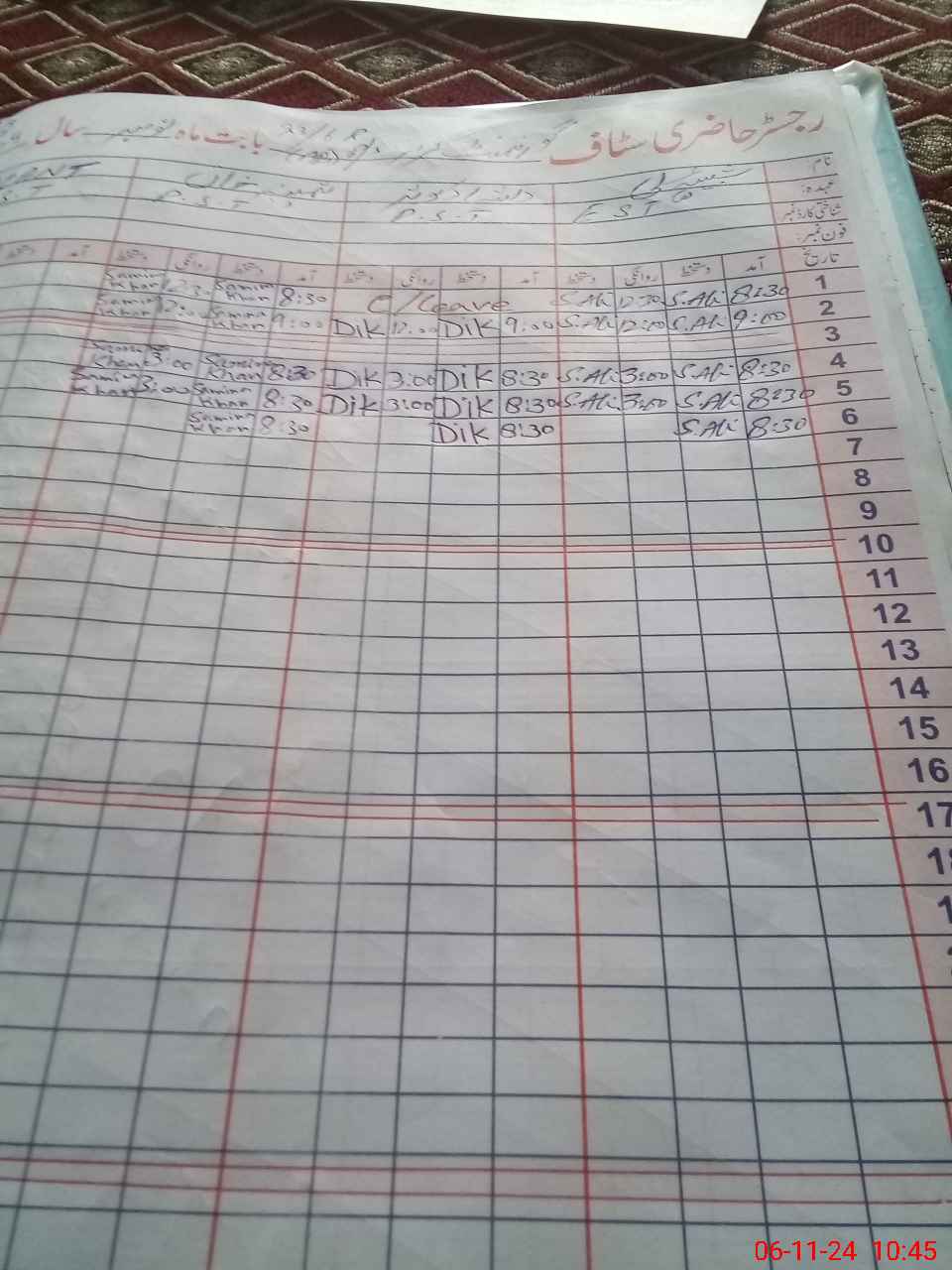 | CNIC | Full Name | Designation | R/C | Absence During Last Calender Month |