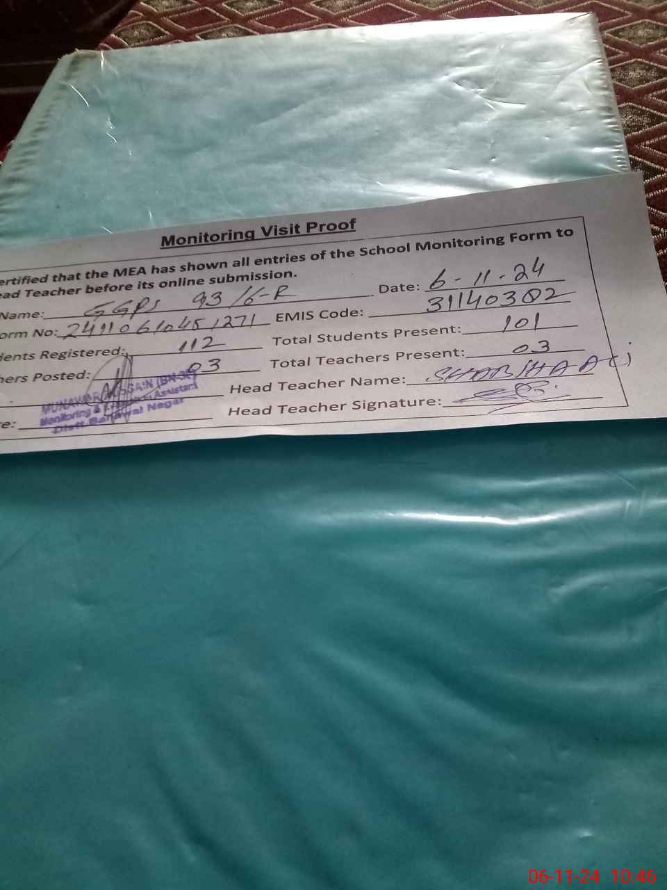 | Attendance Register | Head Teacher | MEA with School | Visit Proof |