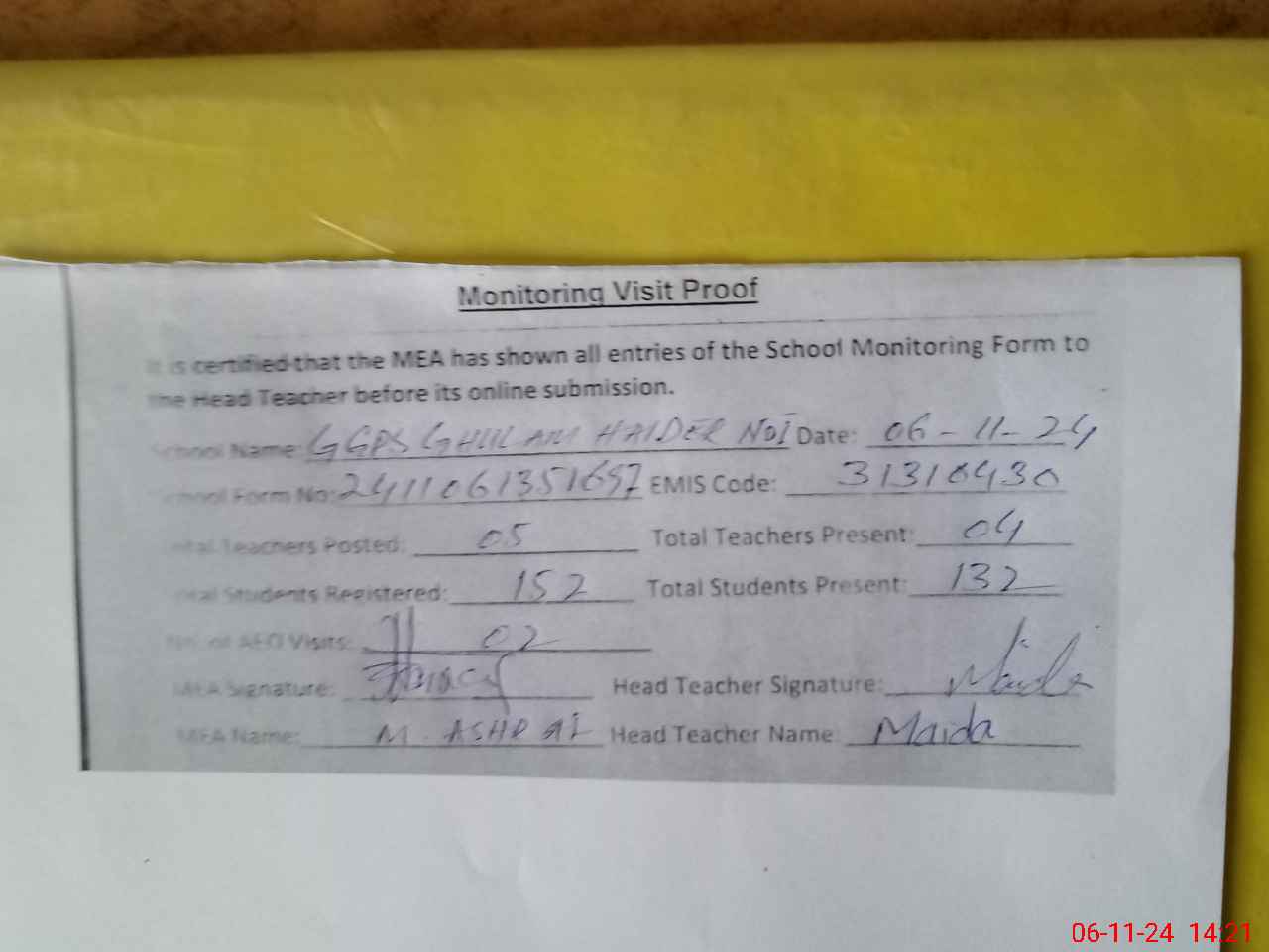 | Attendance Register | Head Teacher | MEA with School | Visit Proof |