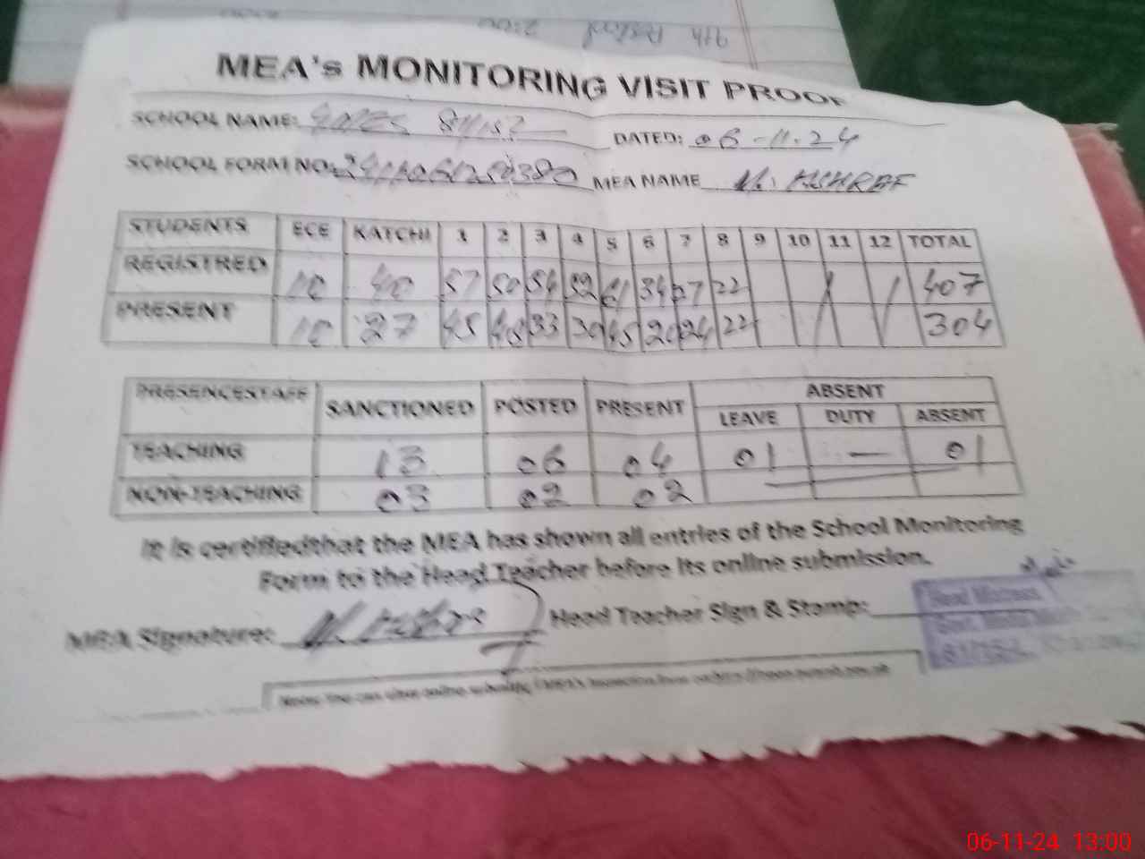 | Attendance Register | Head Teacher | MEA with School | Visit Proof |
