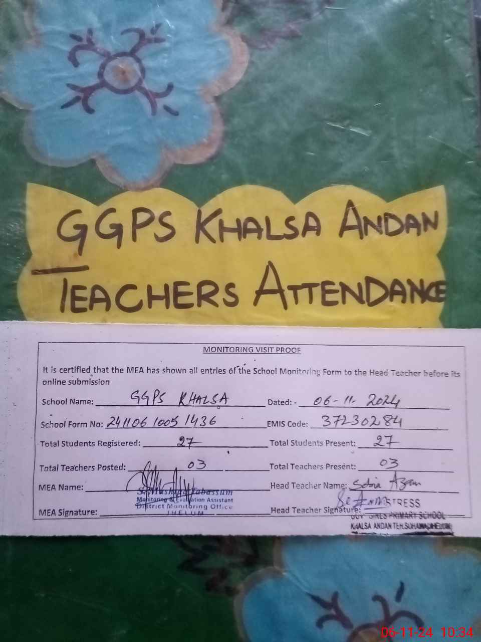 | Attendance Register | Head Teacher | MEA with School | Visit Proof |