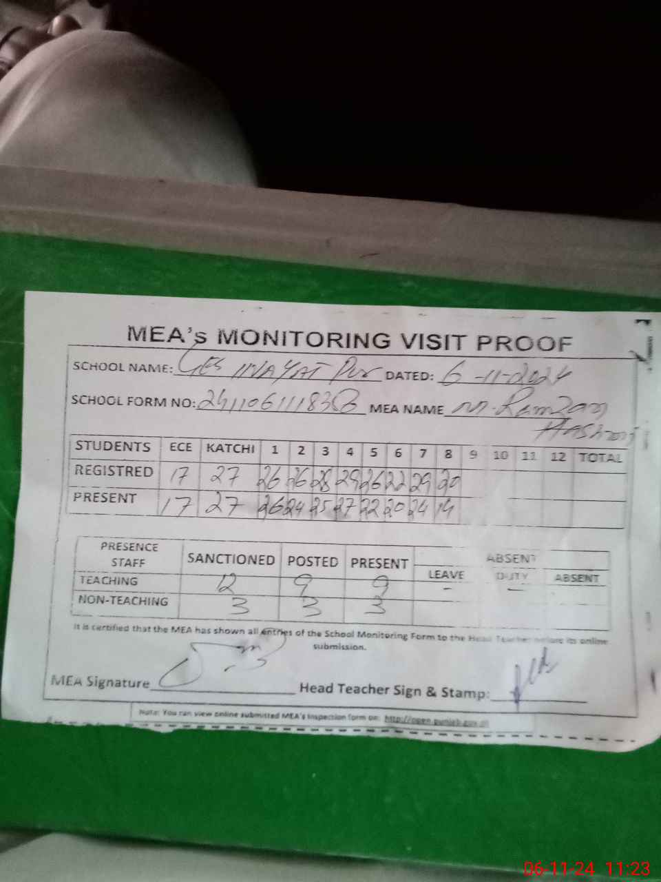 | Attendance Register | Head Teacher | MEA with School | Visit Proof |