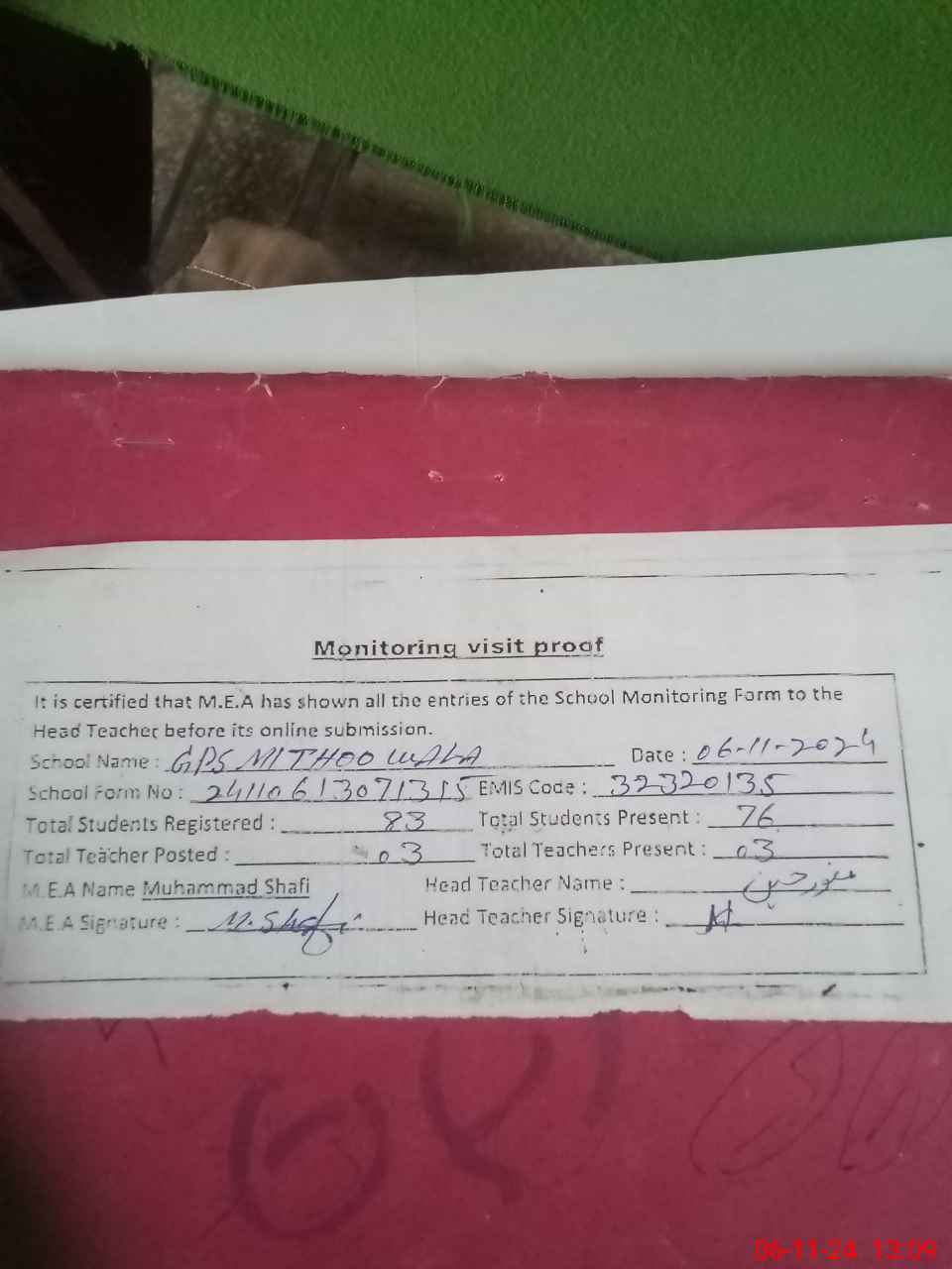 | Attendance Register | Head Teacher | MEA with School | Visit Proof |