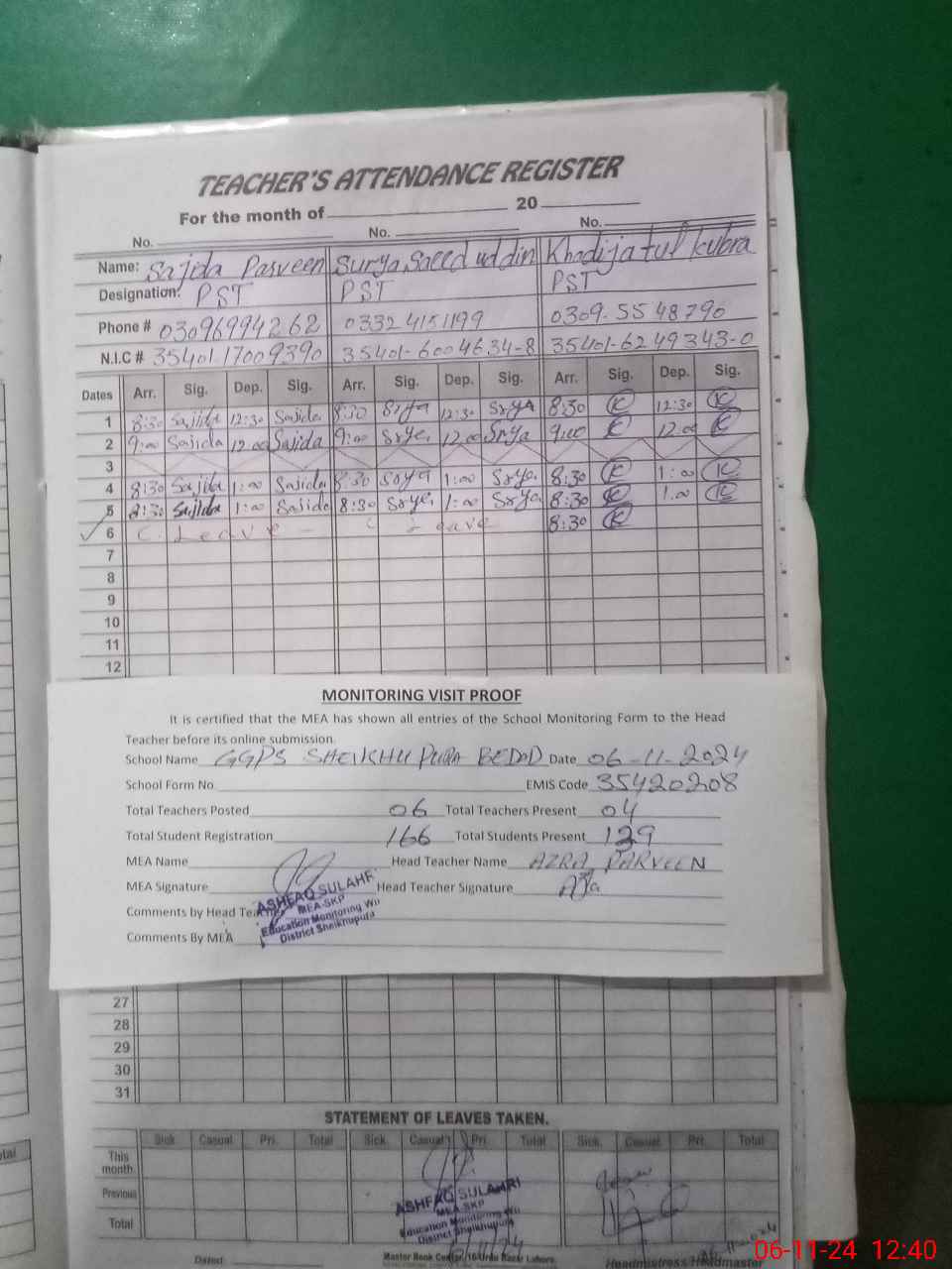 | Attendance Register | Head Teacher | MEA with School | Visit Proof |