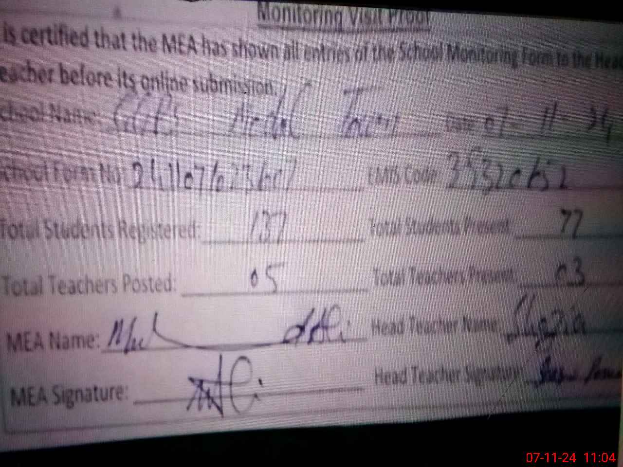 | Attendance Register | Head Teacher | MEA with School | Visit Proof |