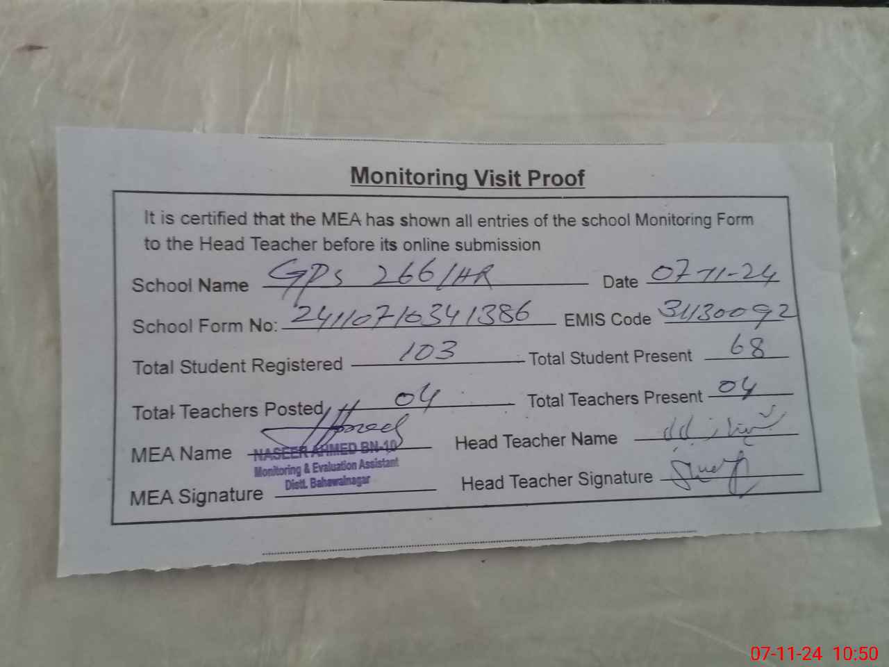 | Attendance Register | Head Teacher | MEA with School | Visit Proof |