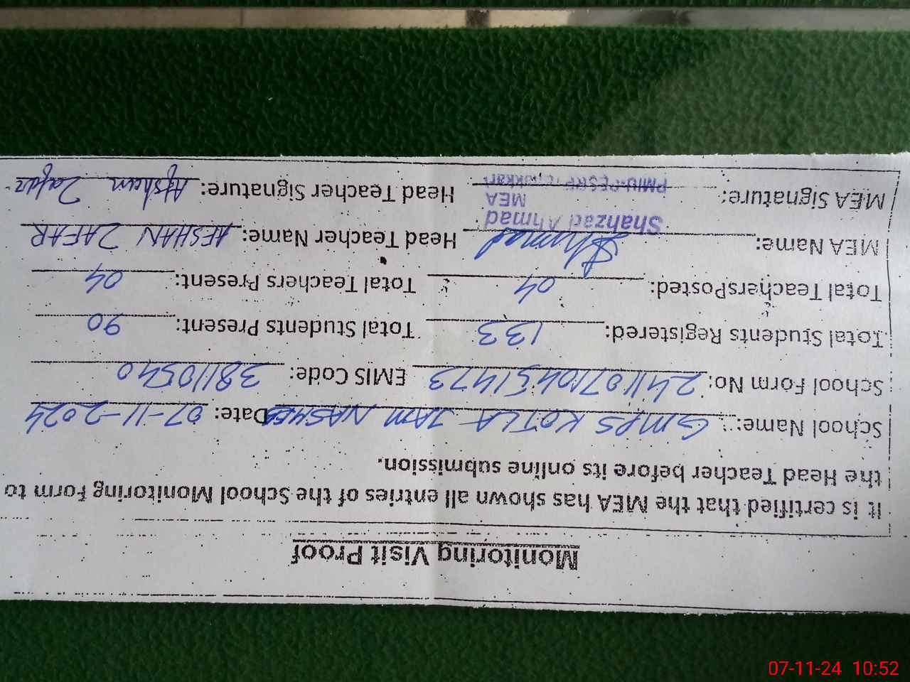 | Certified that this School was Inspected by the Undersigned MEA/DMO Today and the Information Stated Above is as Per Record. | |||||