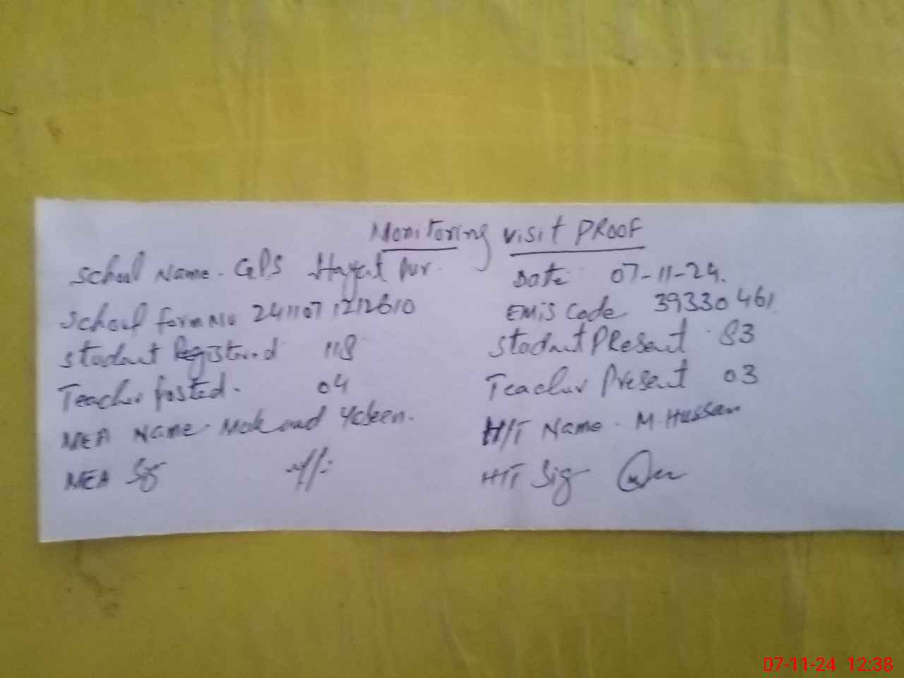 | Attendance Register | Head Teacher | MEA with School | Visit Proof |
