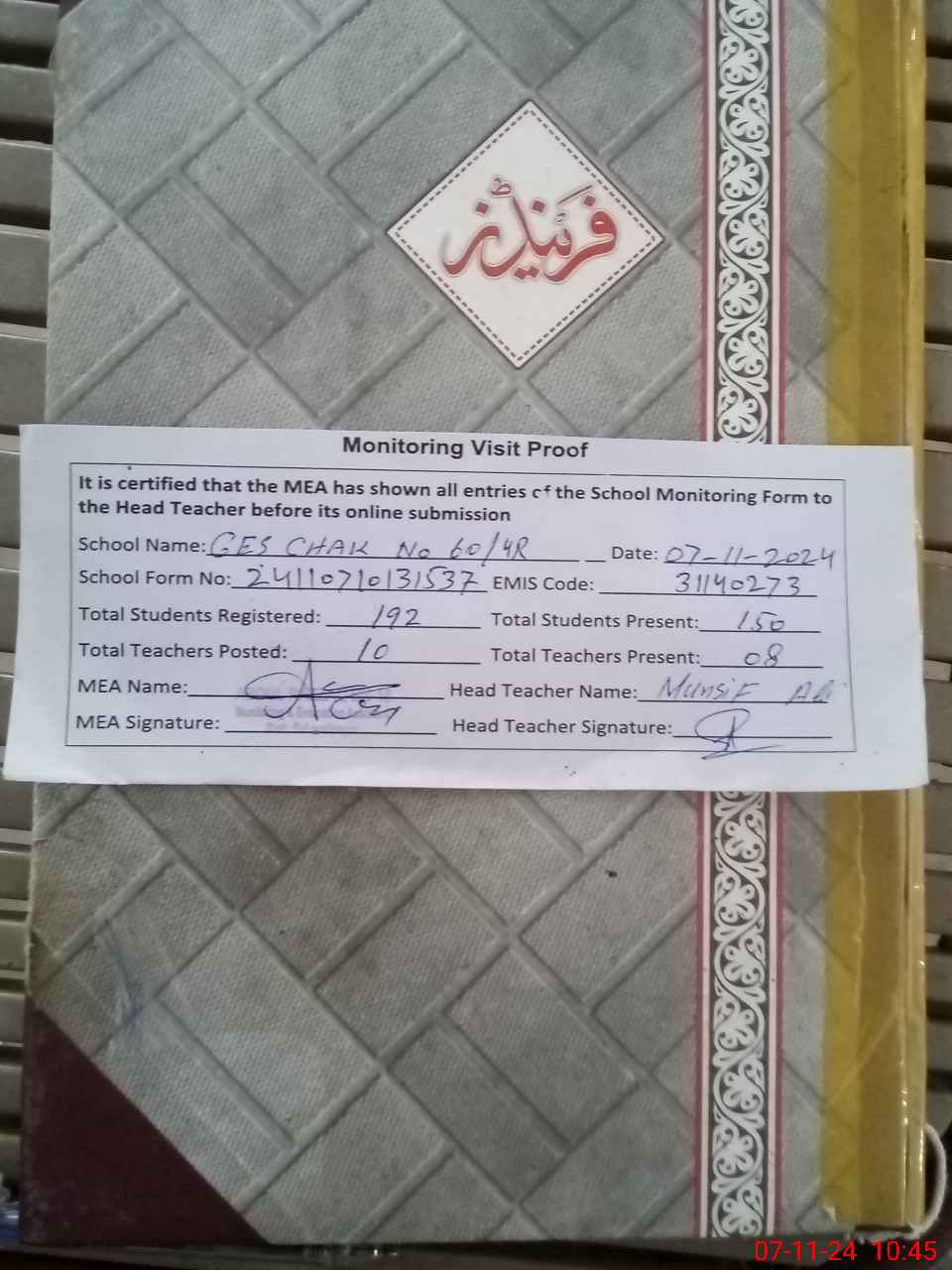 | EMIS Code: 31140273 | Name of School: GES CHAK NO. 60/4-R | |||