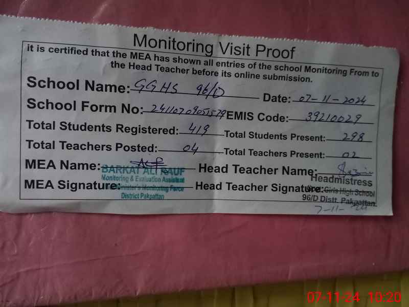 | EMIS Code: 39210029 | Name of School: GGHS CHAK NO. 96 D | |||