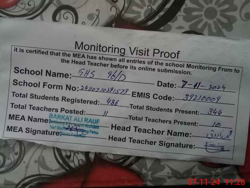 | EMIS Code: 39210009 | Name of School: GHS CHAK NO. 96/D | |||
