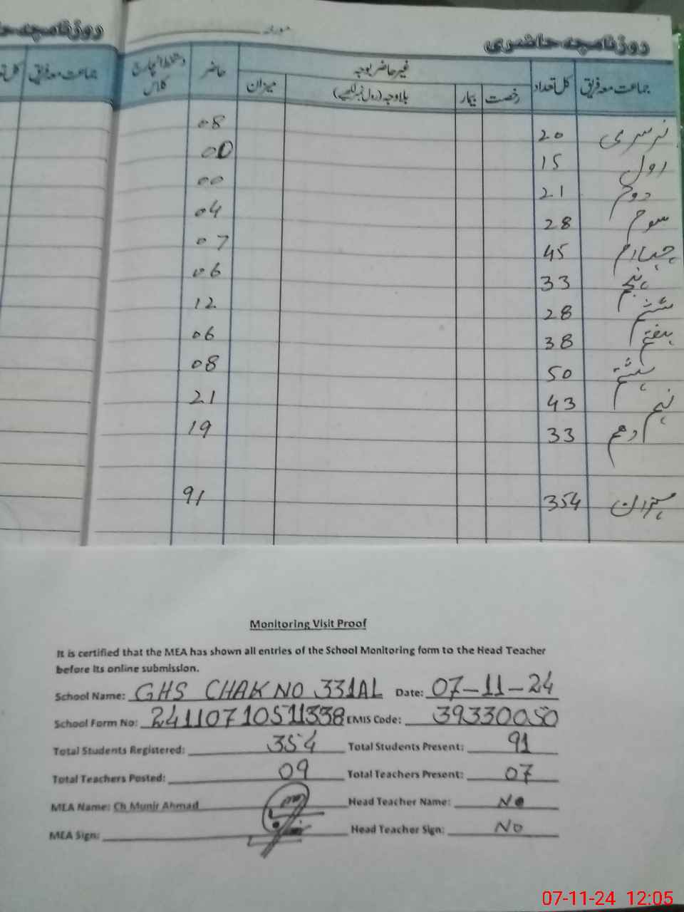 | Remarks (Use Separate Page if Required): Headmaster is not present at on other duty at okara behind on headmaster not signature on visit prof and not picture on display | |||||