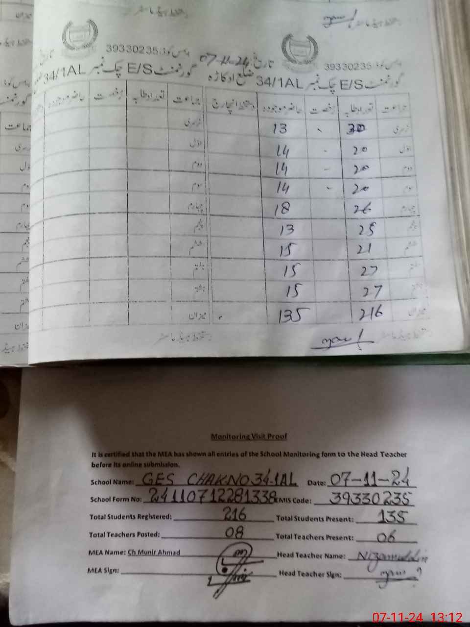 | EMIS Code: 39330235 | Name of School: GES CHAK 34/1-AL | |||