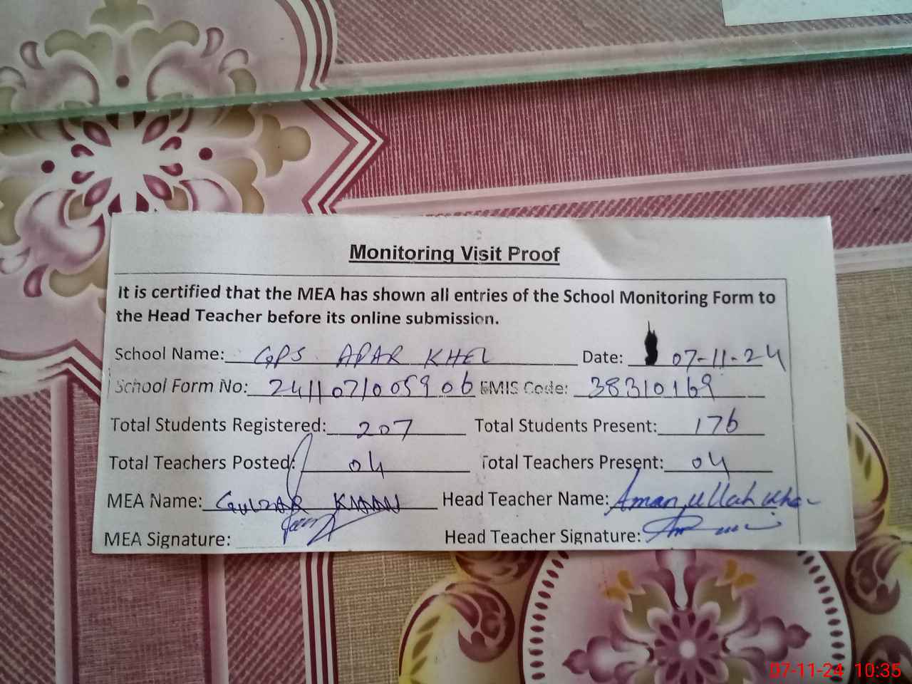 | Attendance Register | Head Teacher | MEA with School | Visit Proof |