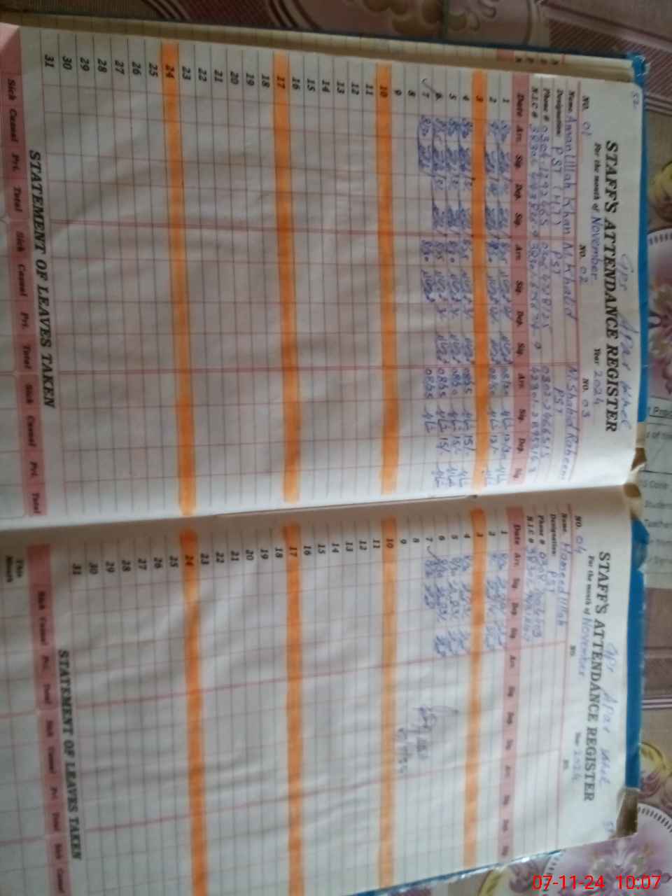 | CNIC | Full Name | Designation | R/C | Absence During Last Calender Month |