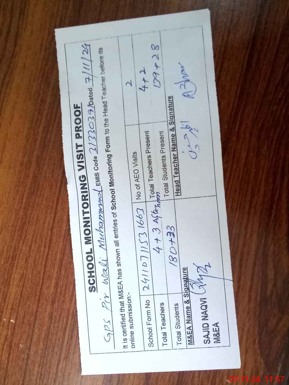 | Attendance Register | Head Teacher | MEA with School | Visit Proof |