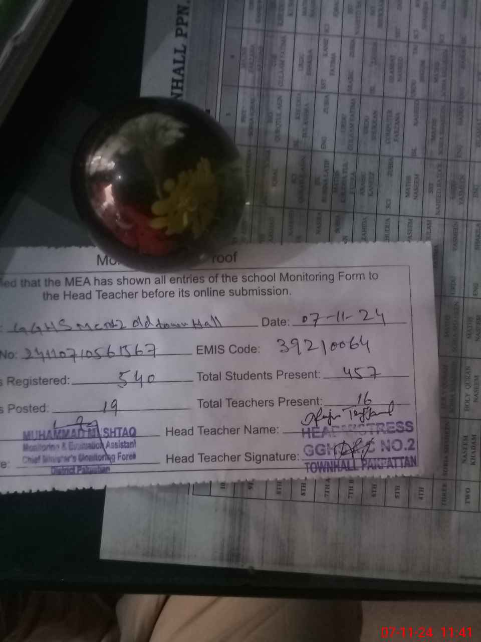| Attendance Register | Head Teacher | MEA with School | Visit Proof |