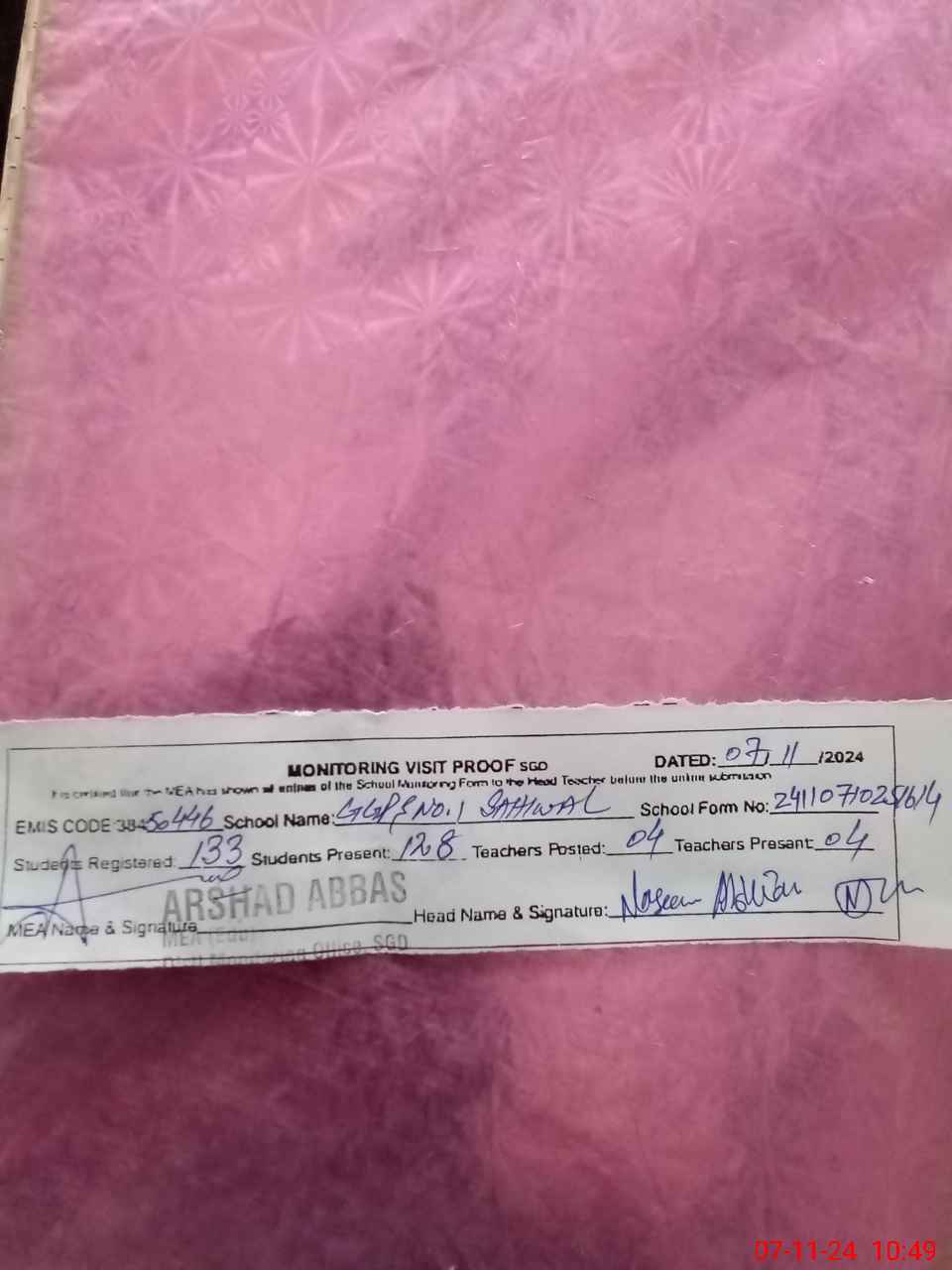 | Certified that this School was Inspected by the Undersigned MEA/DMO Today and the Information Stated Above is as Per Record. | |||||