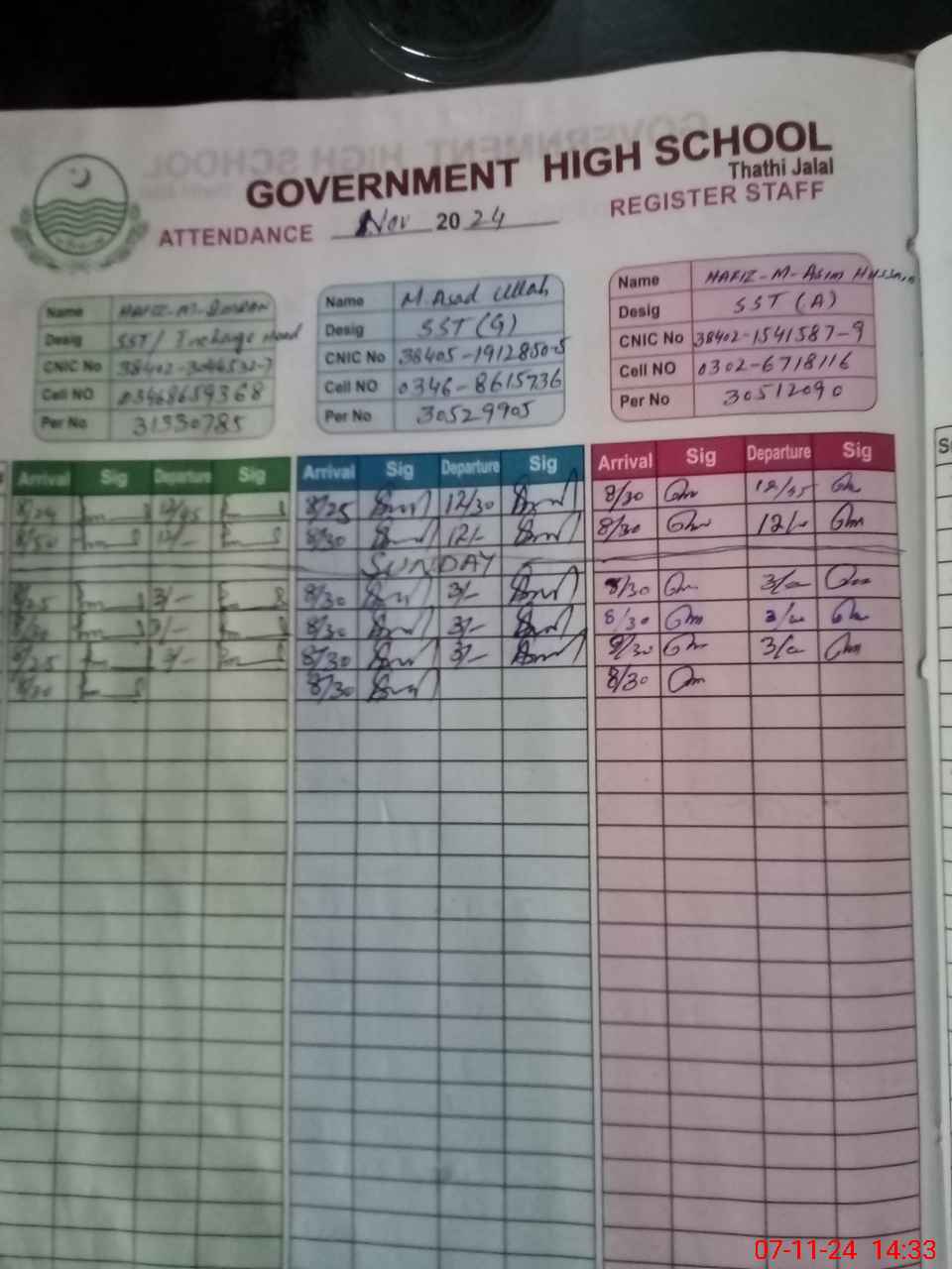 | CNIC | Full Name | Designation | R/C | Absence during last cal. month |