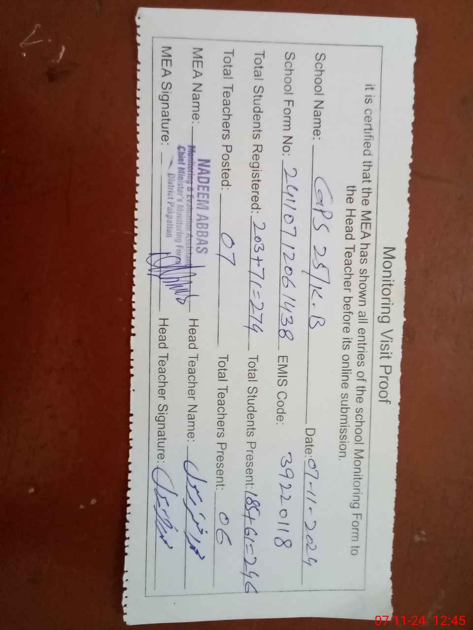 | Attendance Register | Head Teacher | MEA with School | Visit Proof |