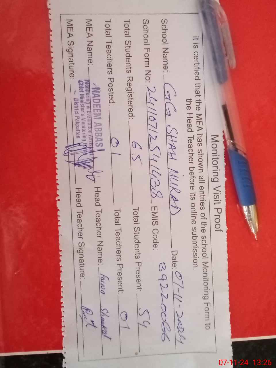 | Attendance Register | Head Teacher | MEA with School | Visit Proof |