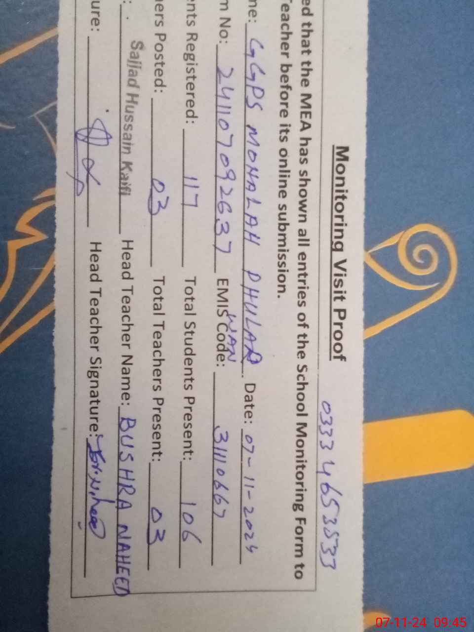 | EMIS Code: 31110667 | Name of School: GGPS MOHALLAH PHULARWAN | |||