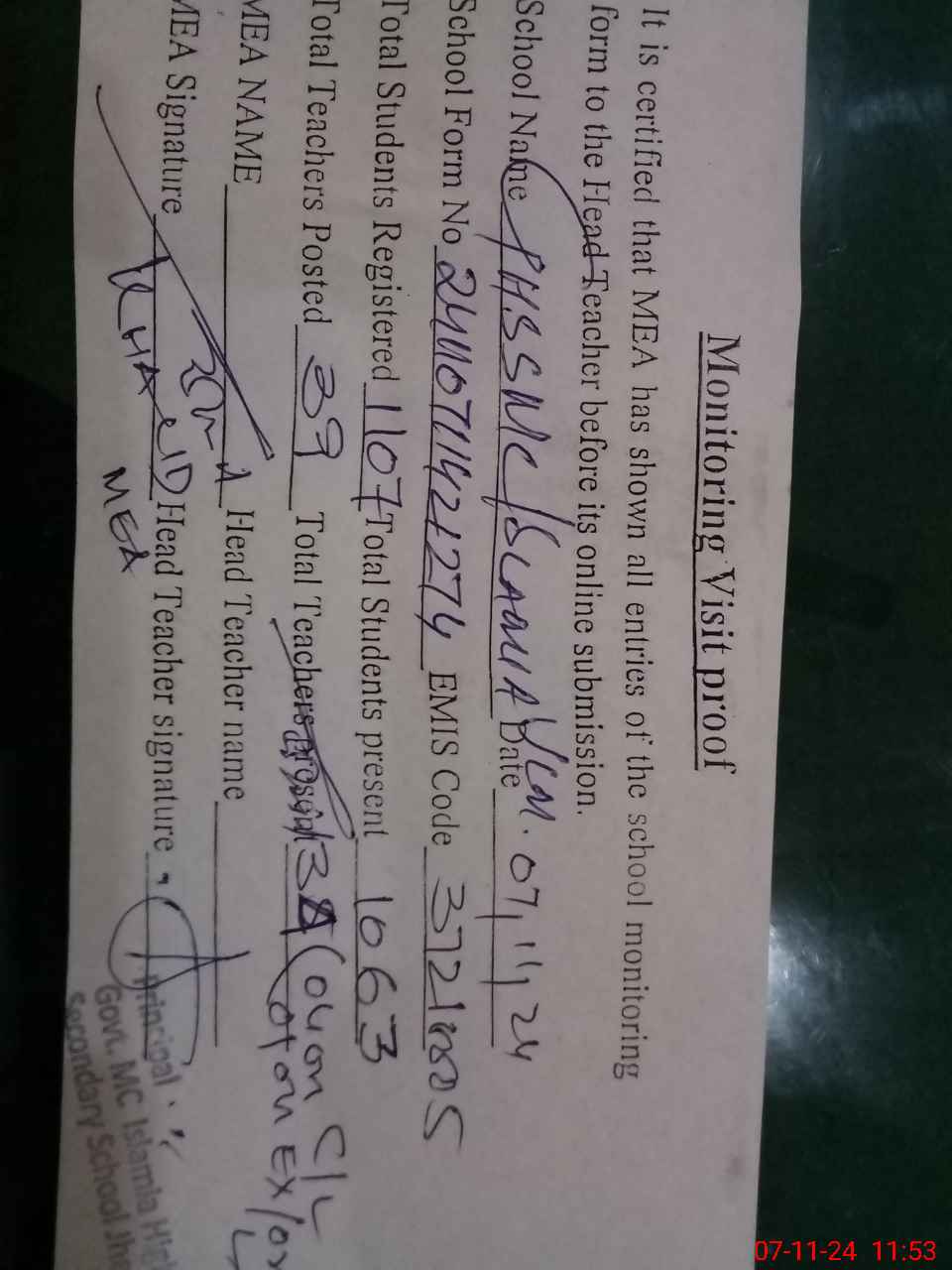 | Attendance Register | Head Teacher | MEA with School | Visit Proof |