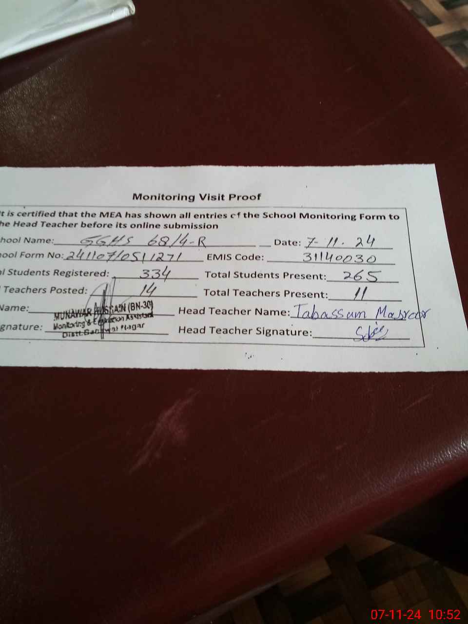 | Attendance Register | Head Teacher | MEA with School | Visit Proof |