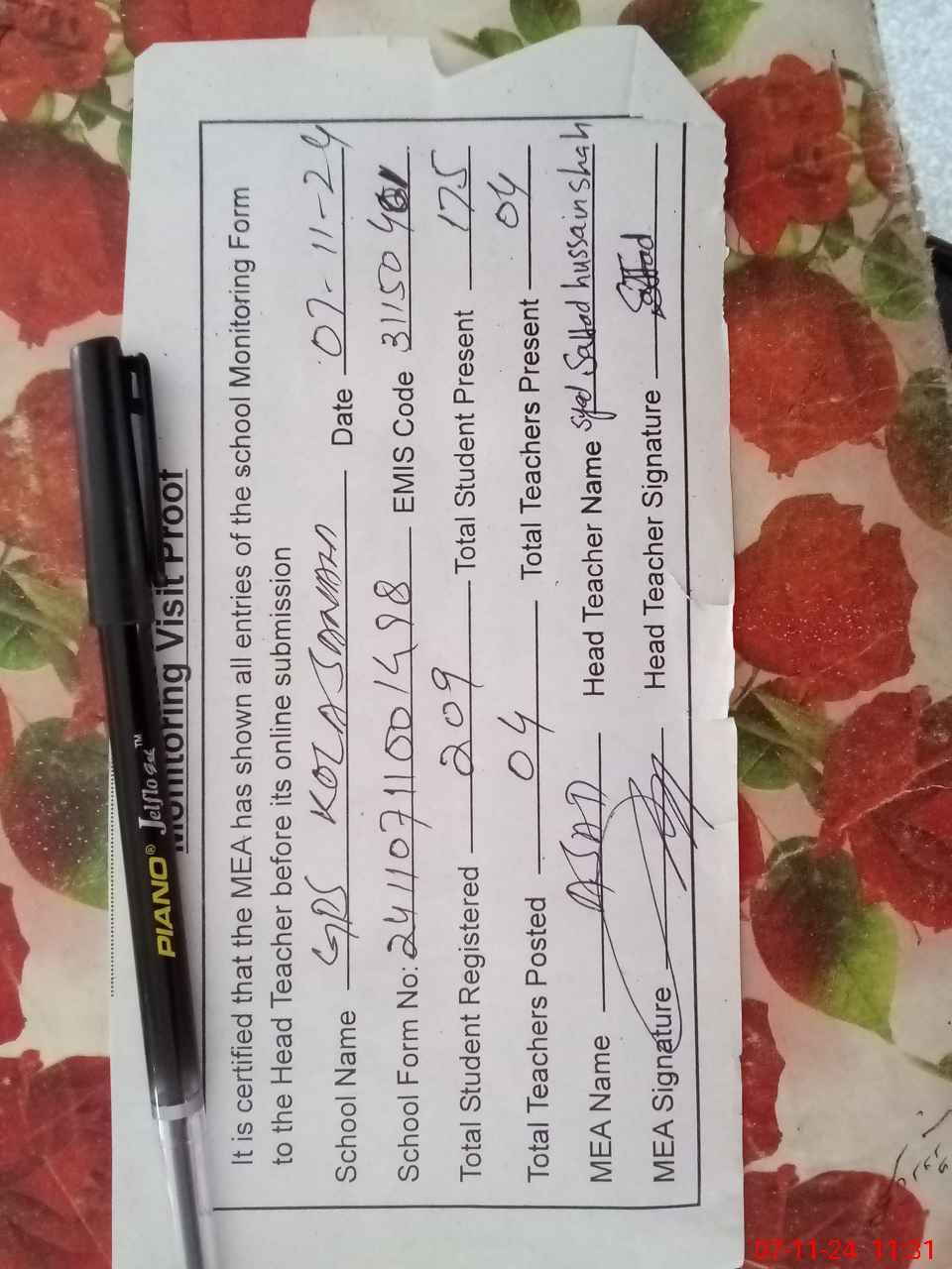 | Attendance Register | Head Teacher | MEA with School | Visit Proof |