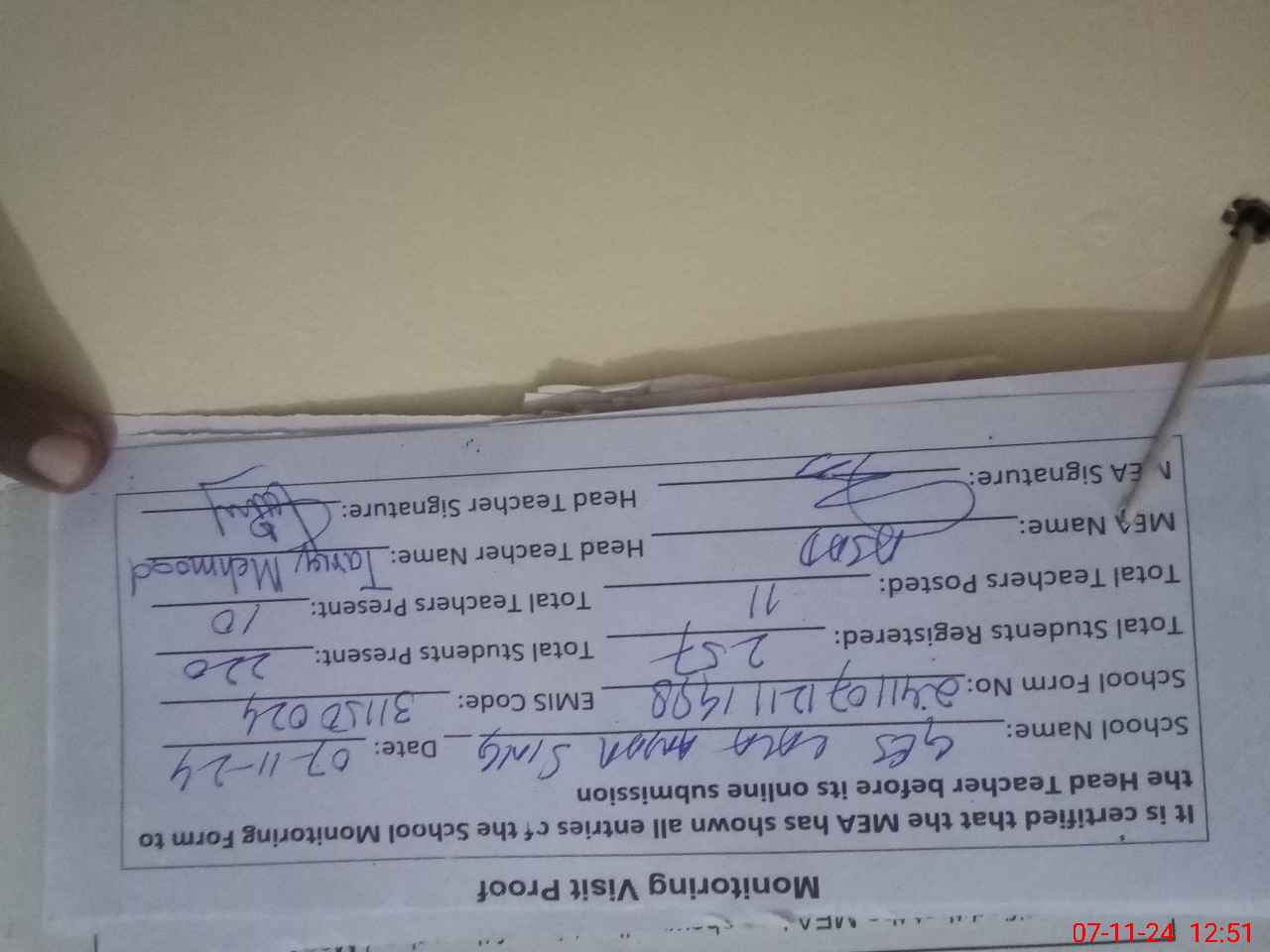 | Attendance Register | Head Teacher | MEA with School | Visit Proof |