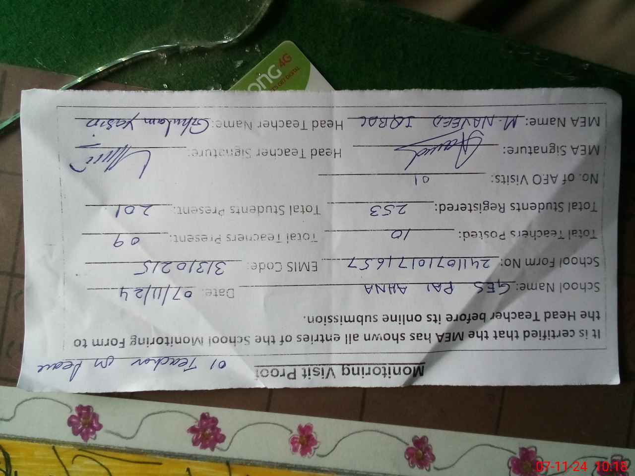 | Attendance Register | Head Teacher | MEA with School | Visit Proof |