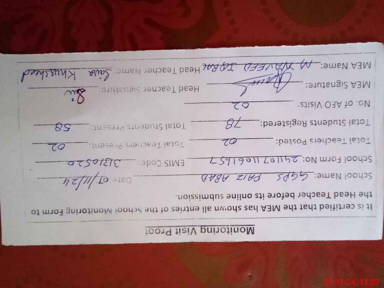 | Certified that this School was Inspected by the Undersigned MEA/DMO Today and the Information Stated Above is as Per Record. | |||||