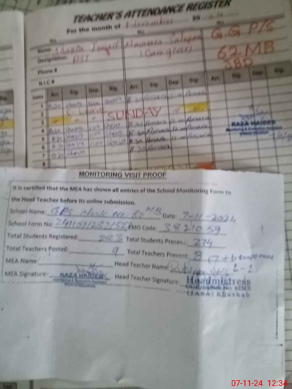 | Attendance Register | Head Teacher | MEA with School | Visit Proof |