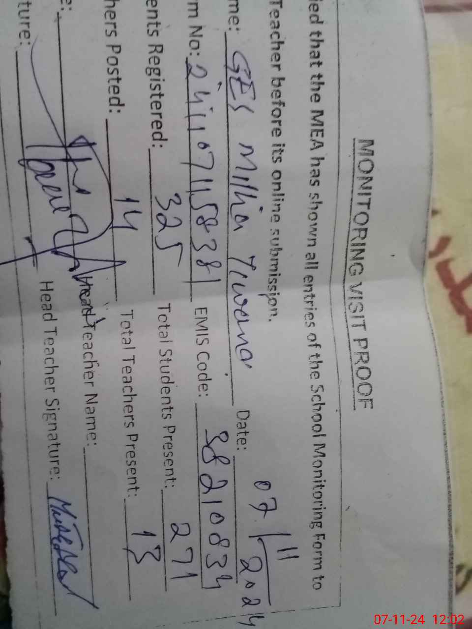 | Attendance Register | Head Teacher | MEA with School | Visit Proof |